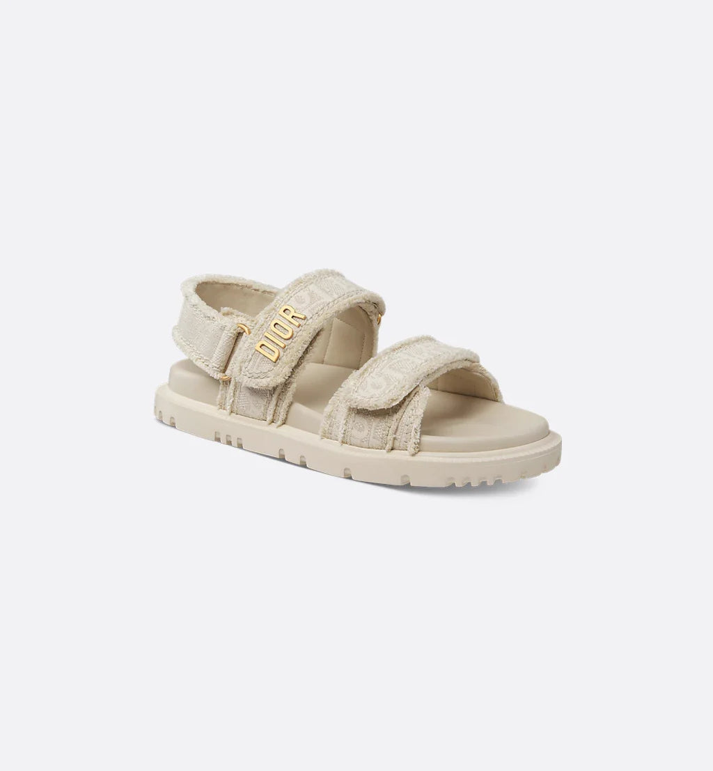 La sandalia Dioract presenta una silueta moderna en algodón bordado con el motivo natural Dior Oblique y bordes deshilachados. Incorpora una plantilla anatómica de piel ultraligera y cómoda, así como tiras autoajustables realzadas por la firma Dior en metal dorado en la tira superior. Esta sandalia aportará un toque contemporáneo a cualquier look.