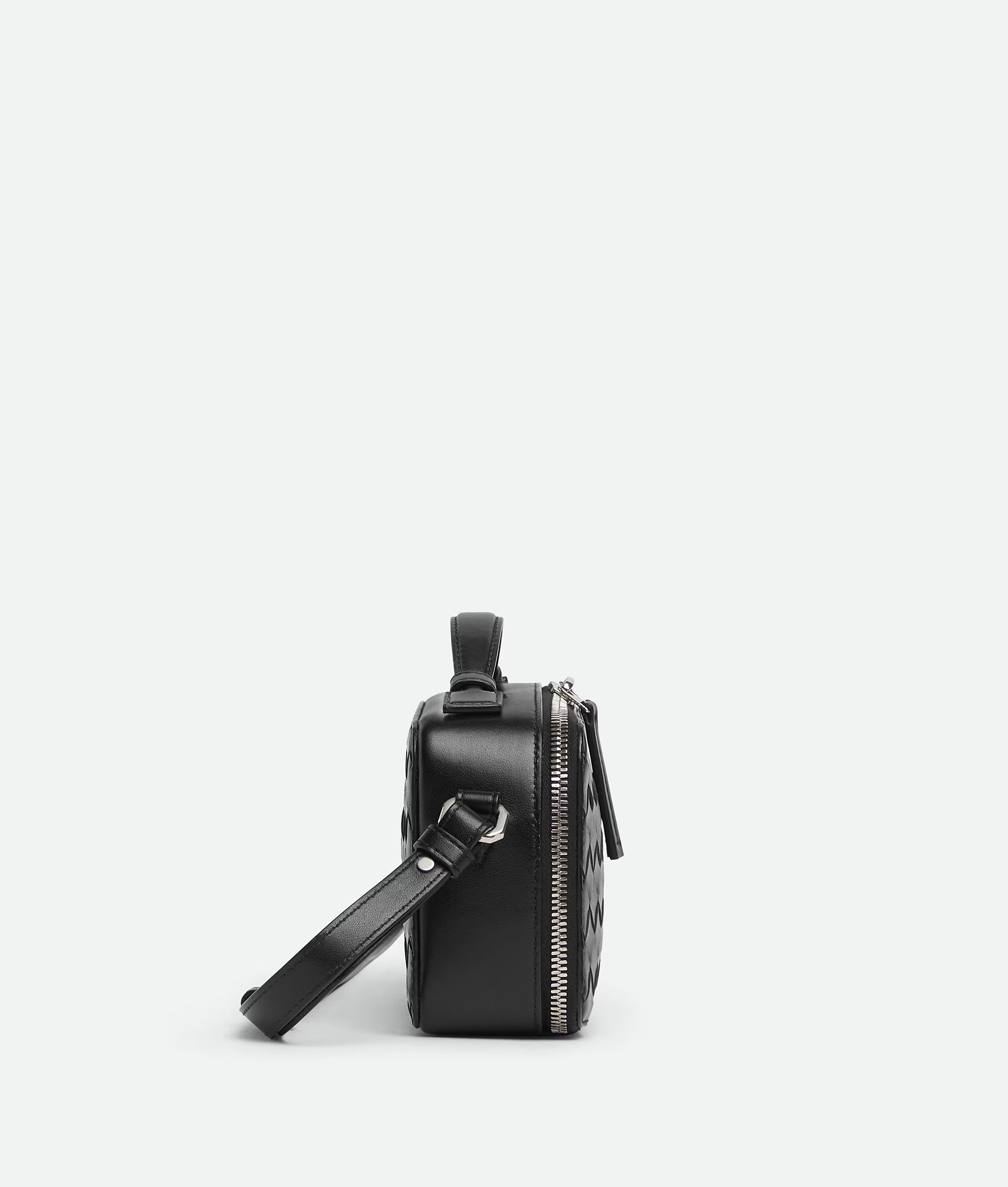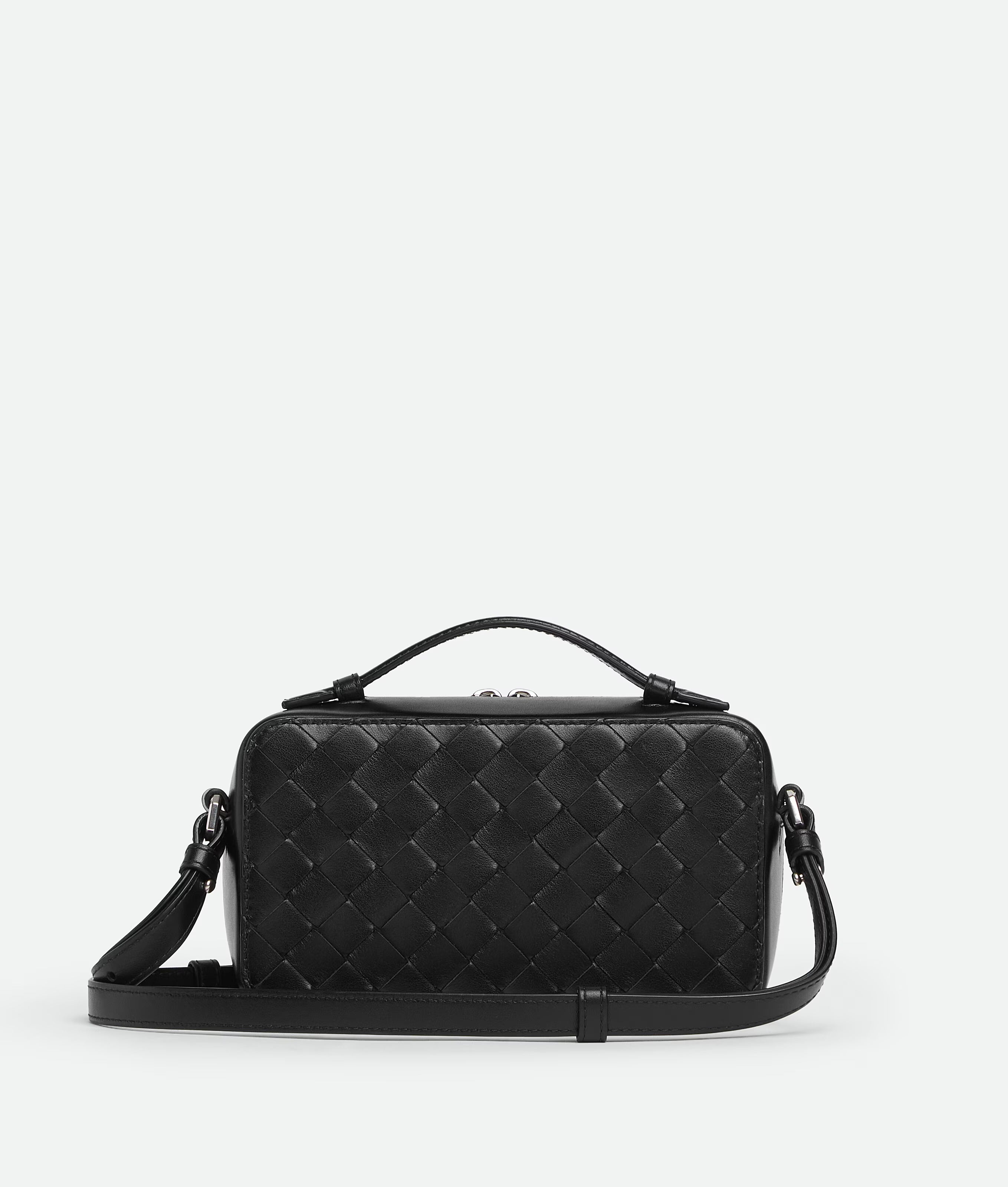 Phone pouch in Intrecciato calf leather with handle and adjustable cross-body strap.
