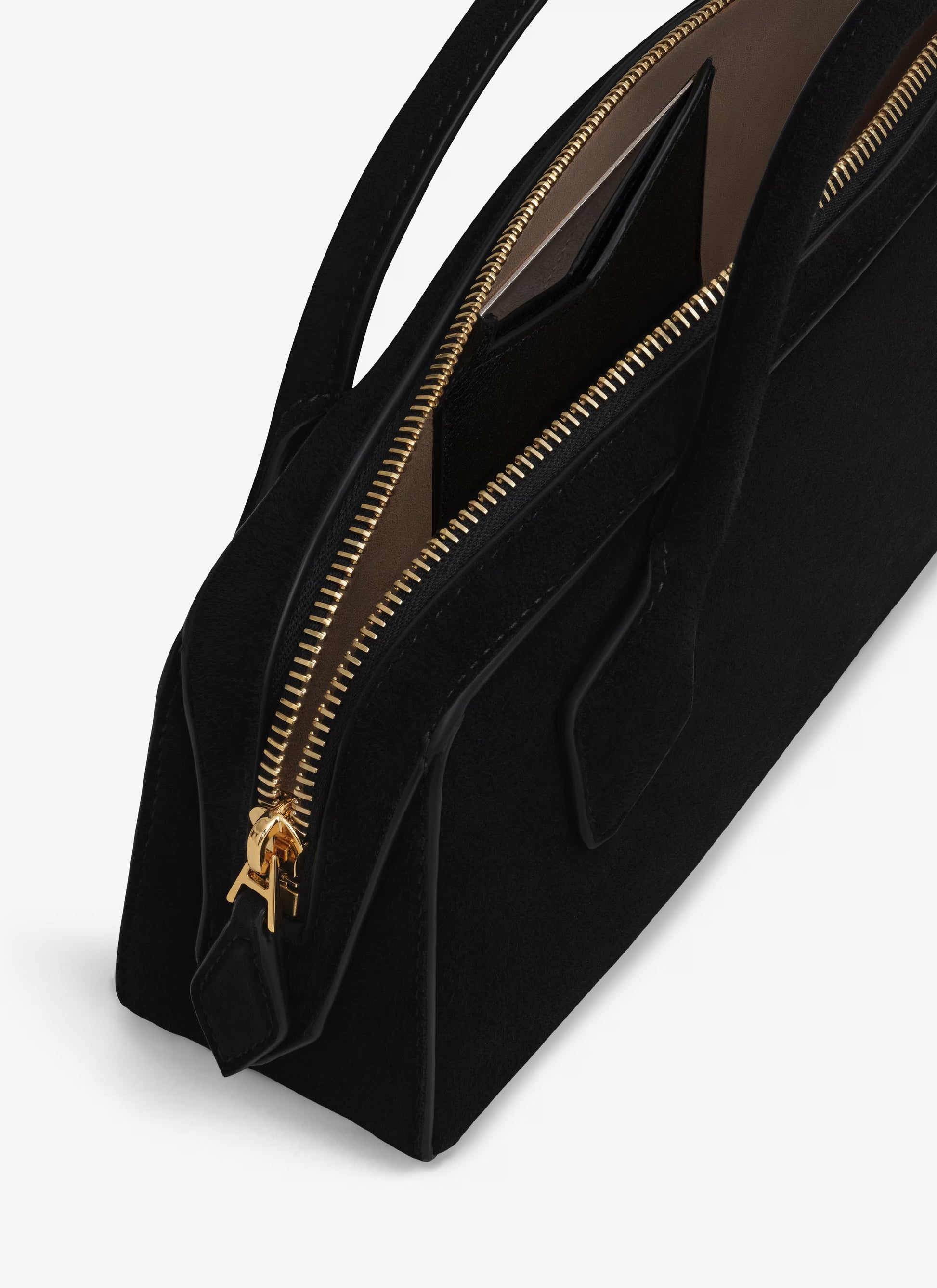 Forma alargada, asas cortas tubulares con lazos decorativos, cierre de doble cremallera, Pequeño espejo extraíble en el bolsillo interior.