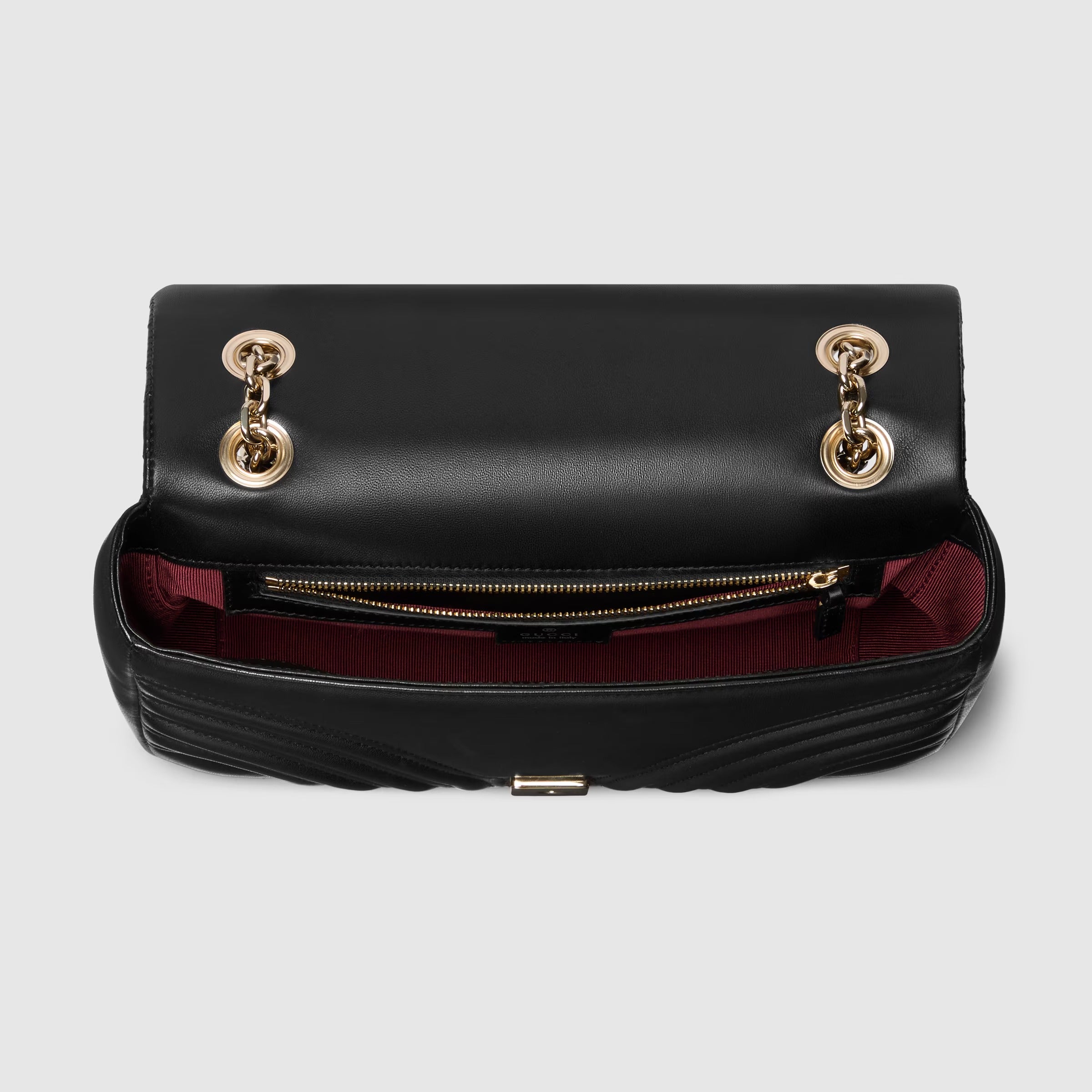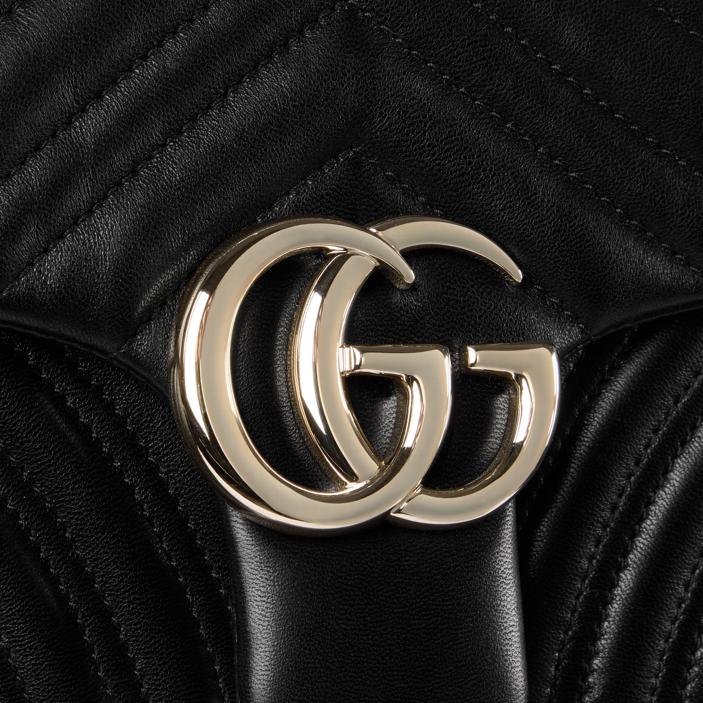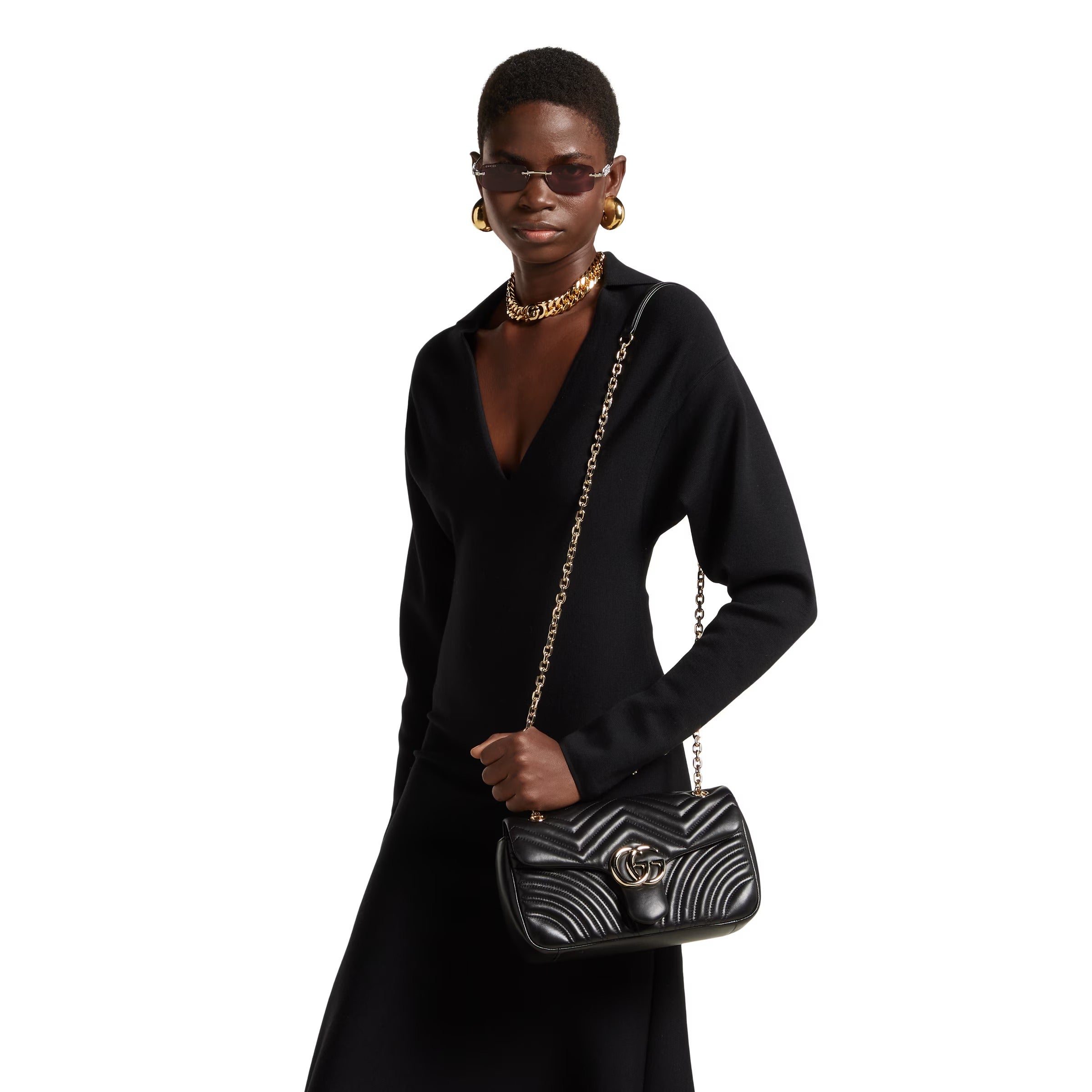 The GG Marmont, a signature collection of the House, features the Double G hardware, a faceted chain strap, and soft construction in an exceptionally supple leather. A sleek back pocket introduces a functional touch to the medium and large sizes.