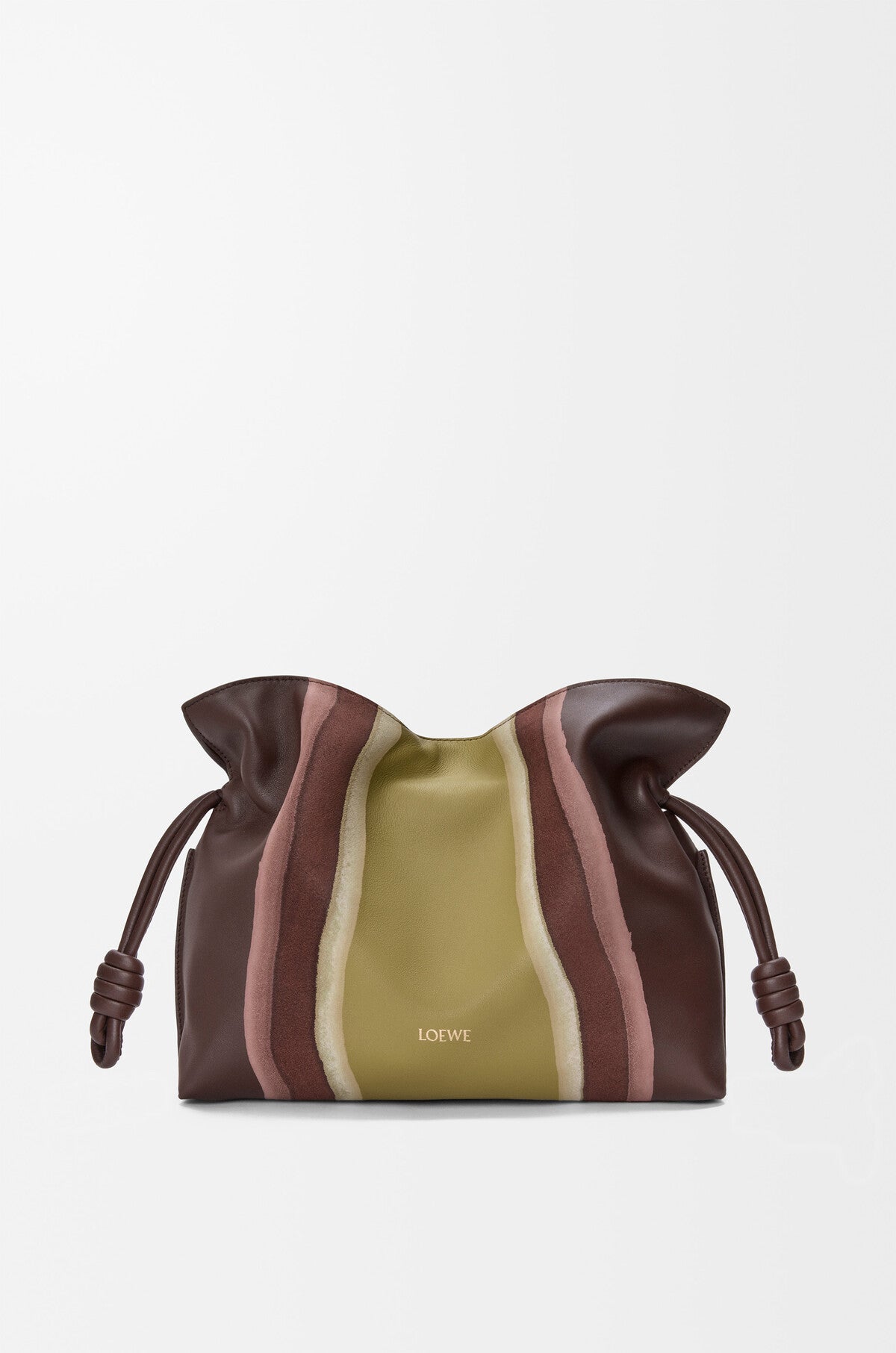 El clutch Flamenco Landscape es un bolso suave y holgado con cierre de presión y cordones con nudos históricos. Esta versión mediana está confeccionada en napa y ante, con capas, comprimido y biselado para crear un efecto único.