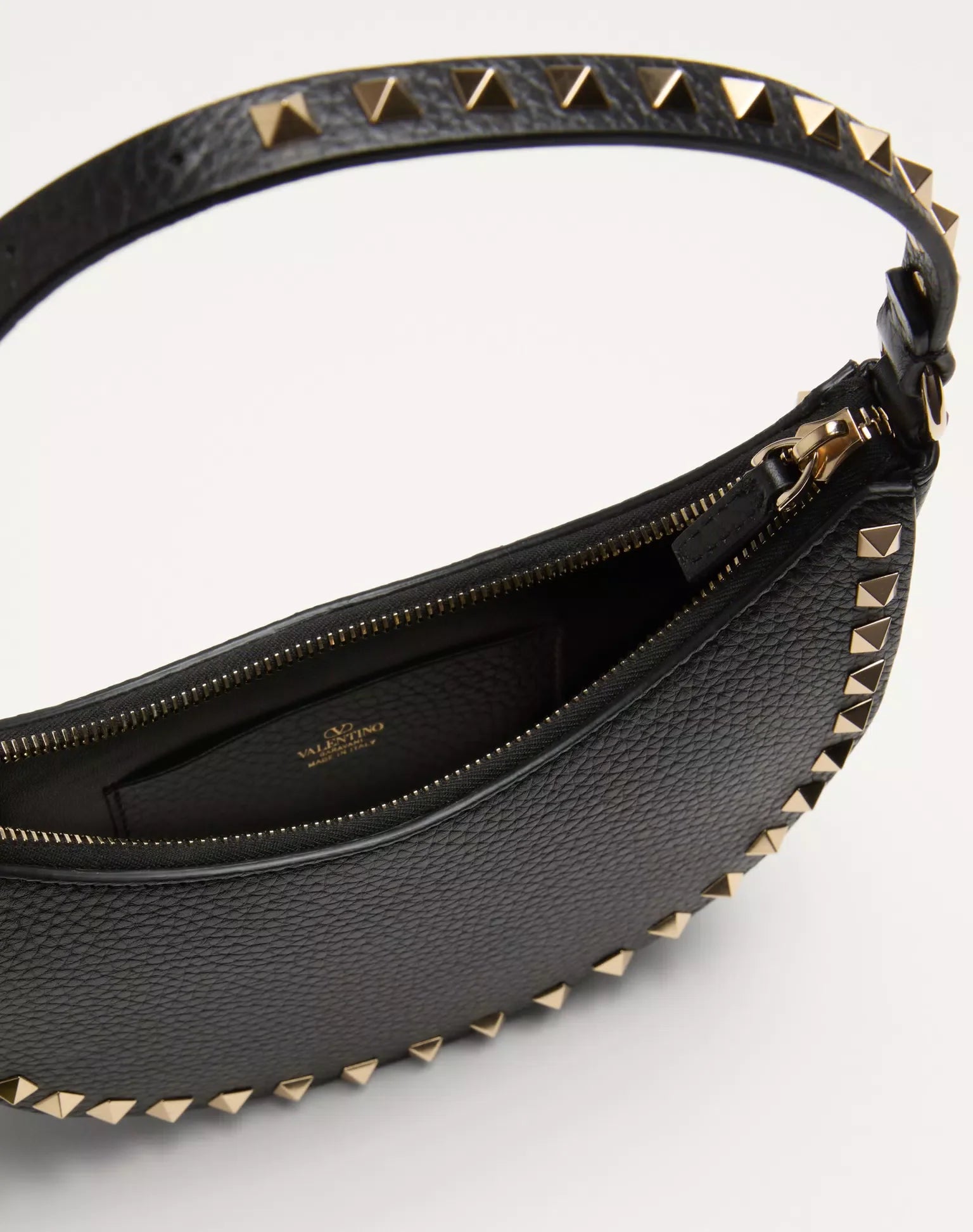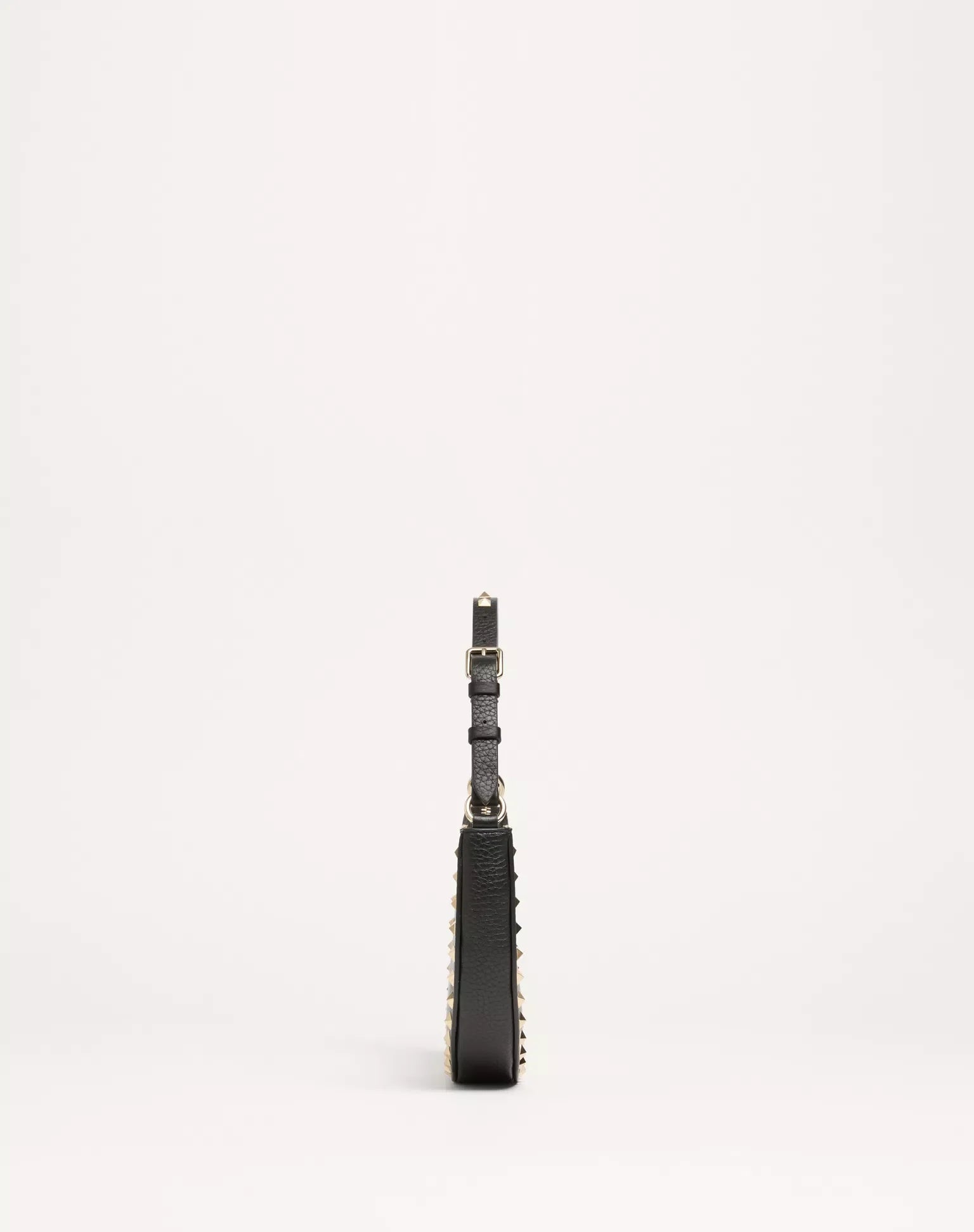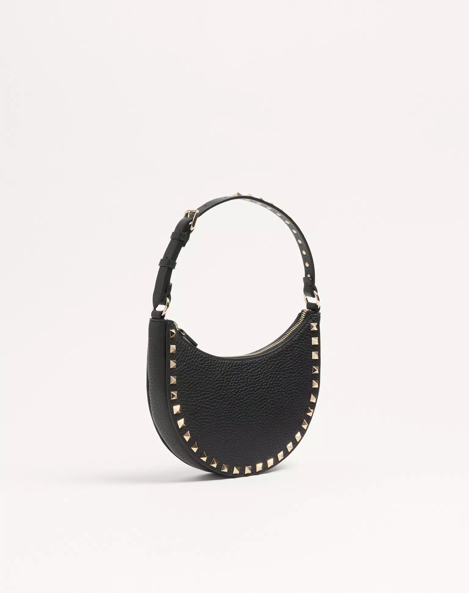 Bolso mini hobo Valentino Garavani Rockstud en piel de becerro granulada. Se puede llevar en la mano o al hombro gracias a su asa ajustable.