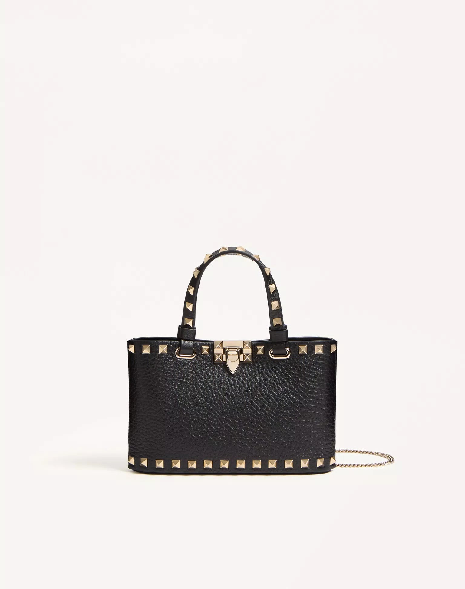 Bolso de compras mini Valentino Garavani Rockstud en piel de becerro granulada. Gracias a sus asas y a la cadena desmontable, se puede llevar en la mano o al hombro/cruzado.