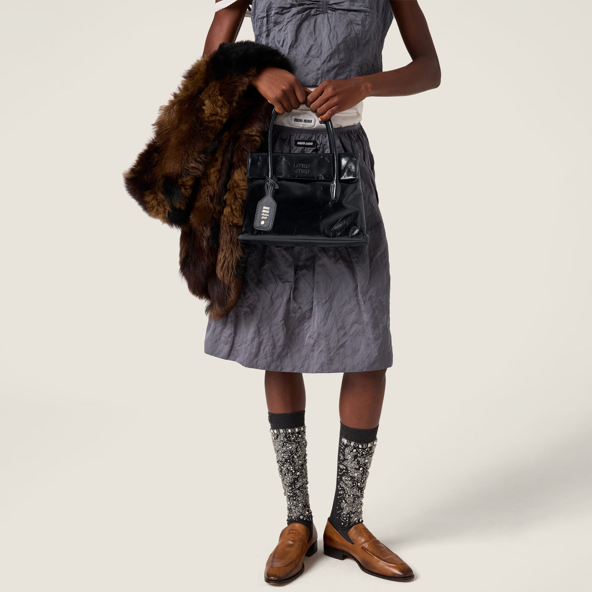 Líneas estructuradas y detalles sofisticados definen este bolso de piel de becerro inspirado en los archivos de Miu Miu de 2006. Su elegancia, que combina clasicismo y experimentación, se ve realzada por el icónico logotipo en la parte delantera y el acabado de piel brillante.