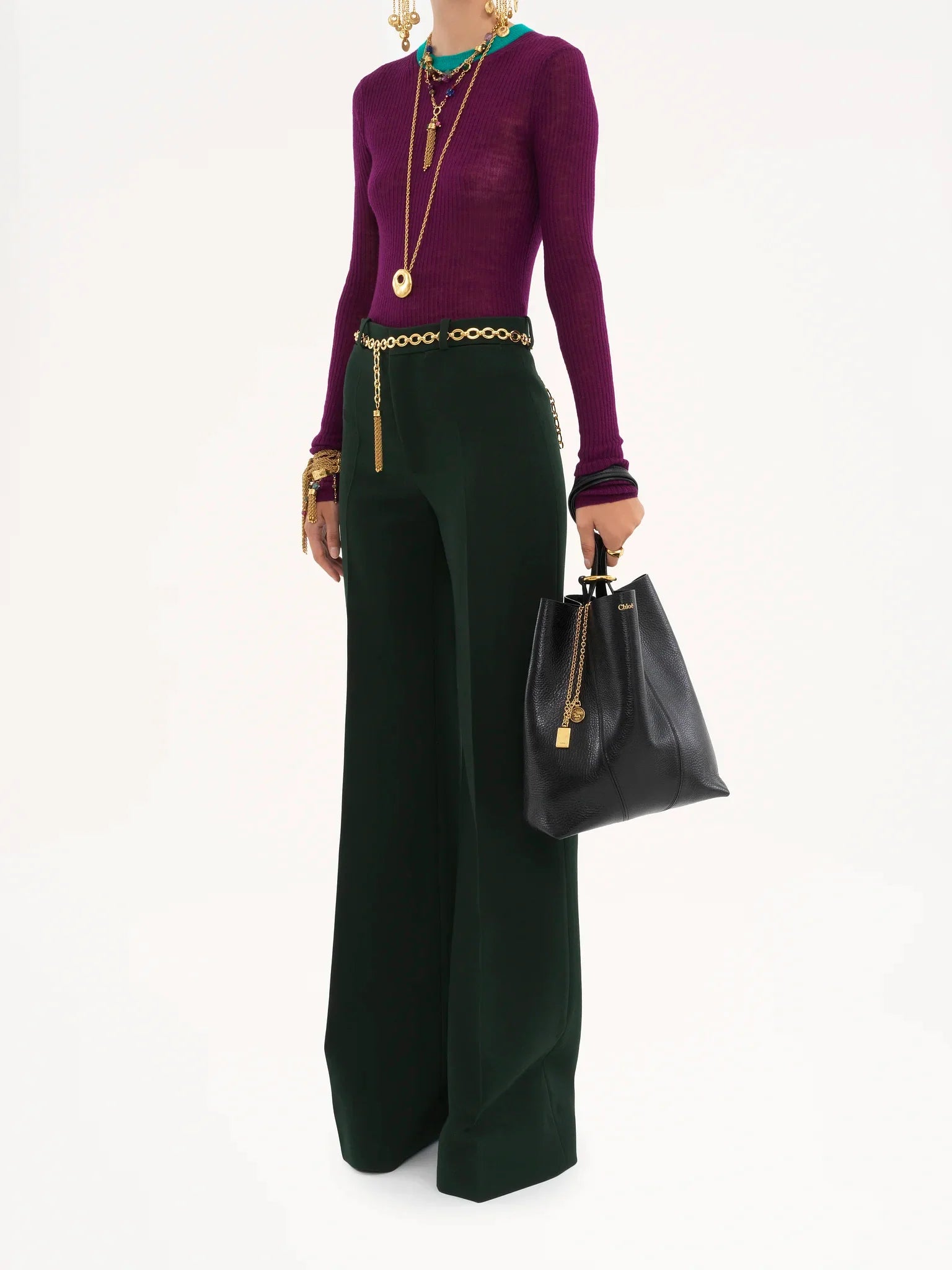 Crafted from shiny grained calfskin, the large Chloé Spin tote bag has a minimalist silhouette elevated with graphic lines. A dangling chain features the Maison's signature Chloé and Horse Medals.