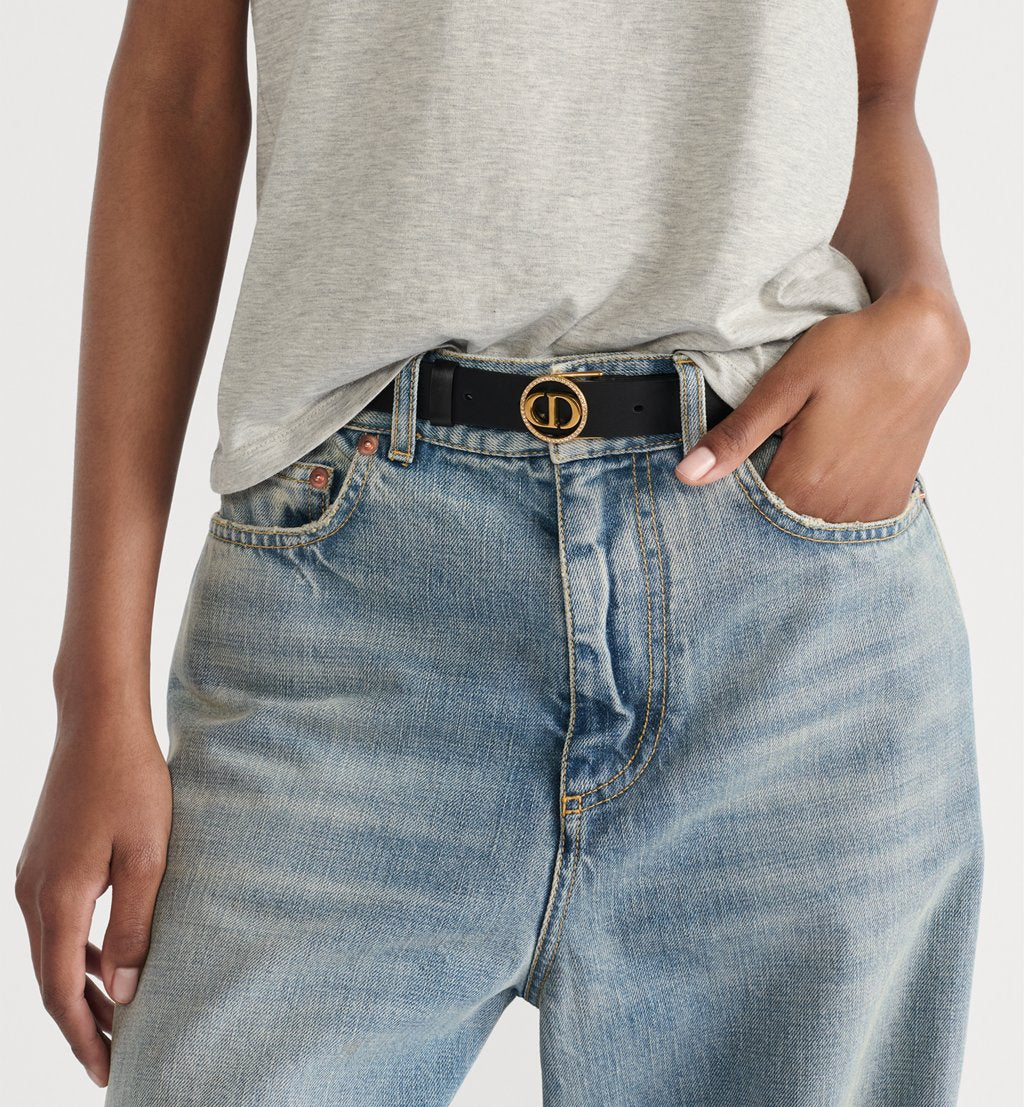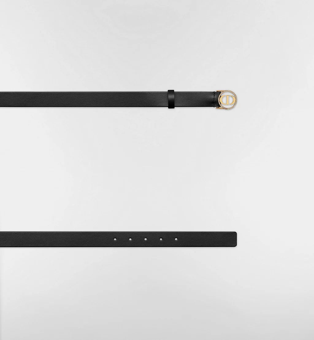 The 30 Montaigne Circled belt revisits the House's hallmark signature in a graphic style. Crafted in black smooth calfskin, it is enhanced by the 30 Montaigne CD buckle framed by a shiny gold-finish metal circle embellished with a pavé of silver-tone crystals. The belt will lend a refined, luminous look to a Bar jacket, dress or jeans.