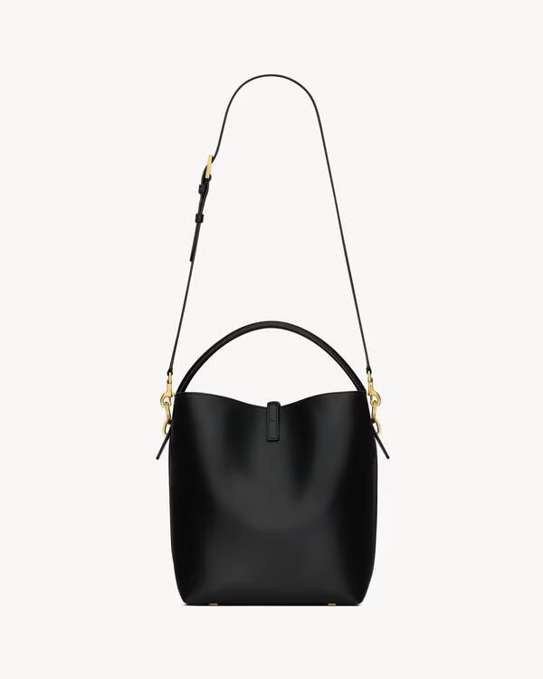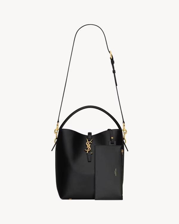 Bucket bag featuring the cassandre hook closure, top handle and an adjustable and detachable shoulder strap. The piece is complete with a removable zip pouch.