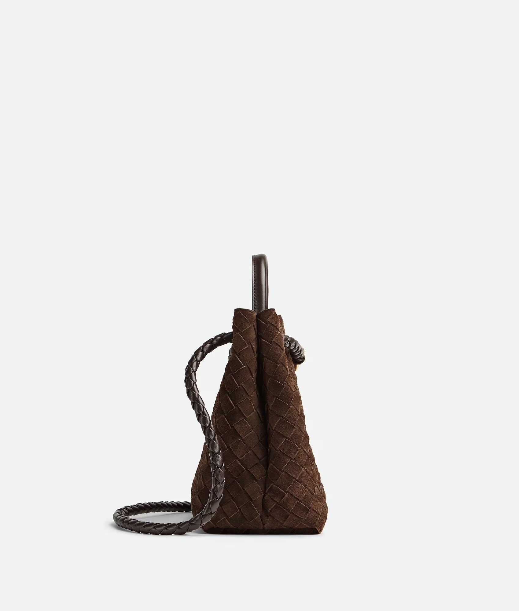 Top handle bag in supple Intrecciato suede with signature knot detail and sliding cross-body strap.