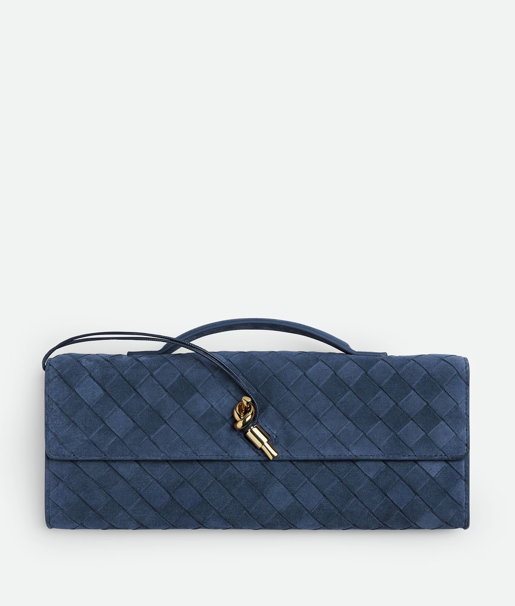 Top handle clutch in Intrecciato suede with signature knot closure.