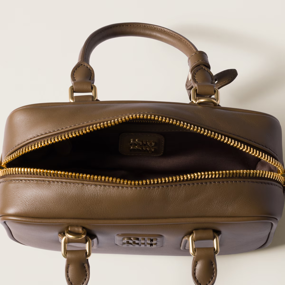 This Arcadie leather bag expresses a notion of fashion as a means of translating a reaction to current reality into material form. The light padding gives the bag a voluminous look and a cosmopolitan style. The lettering logo, which echoes the finishes of the metal hardware, crosses the boundaries between function and decoration and helps to define the distinctive and iconic aesthetic of the top-handle bag.