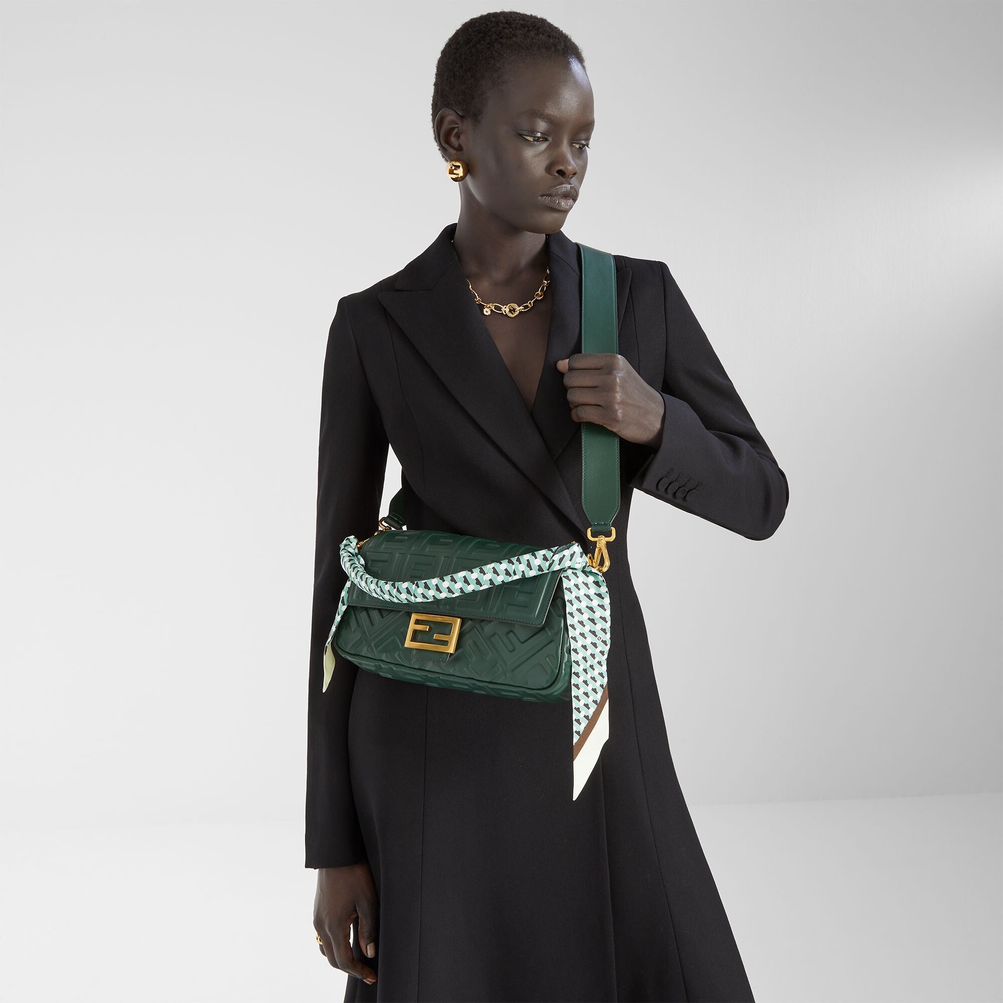 Made of a particularly soft and hard-wearing, dark green calfskin with a 3D-effect, embossed iconic FF motif. Decorated with an FF clasp.