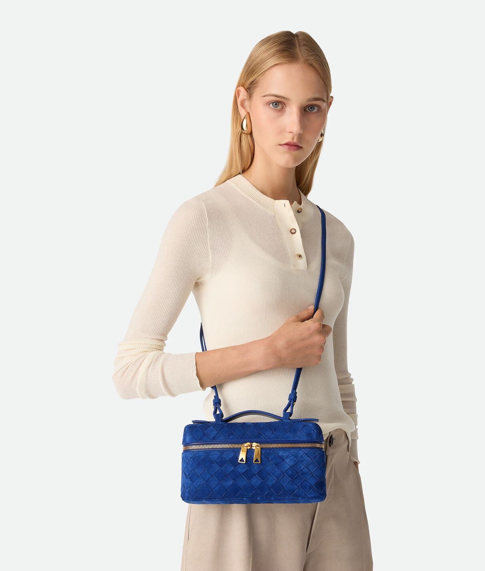 Vanity case in Intrecciato suede with detachable strap.