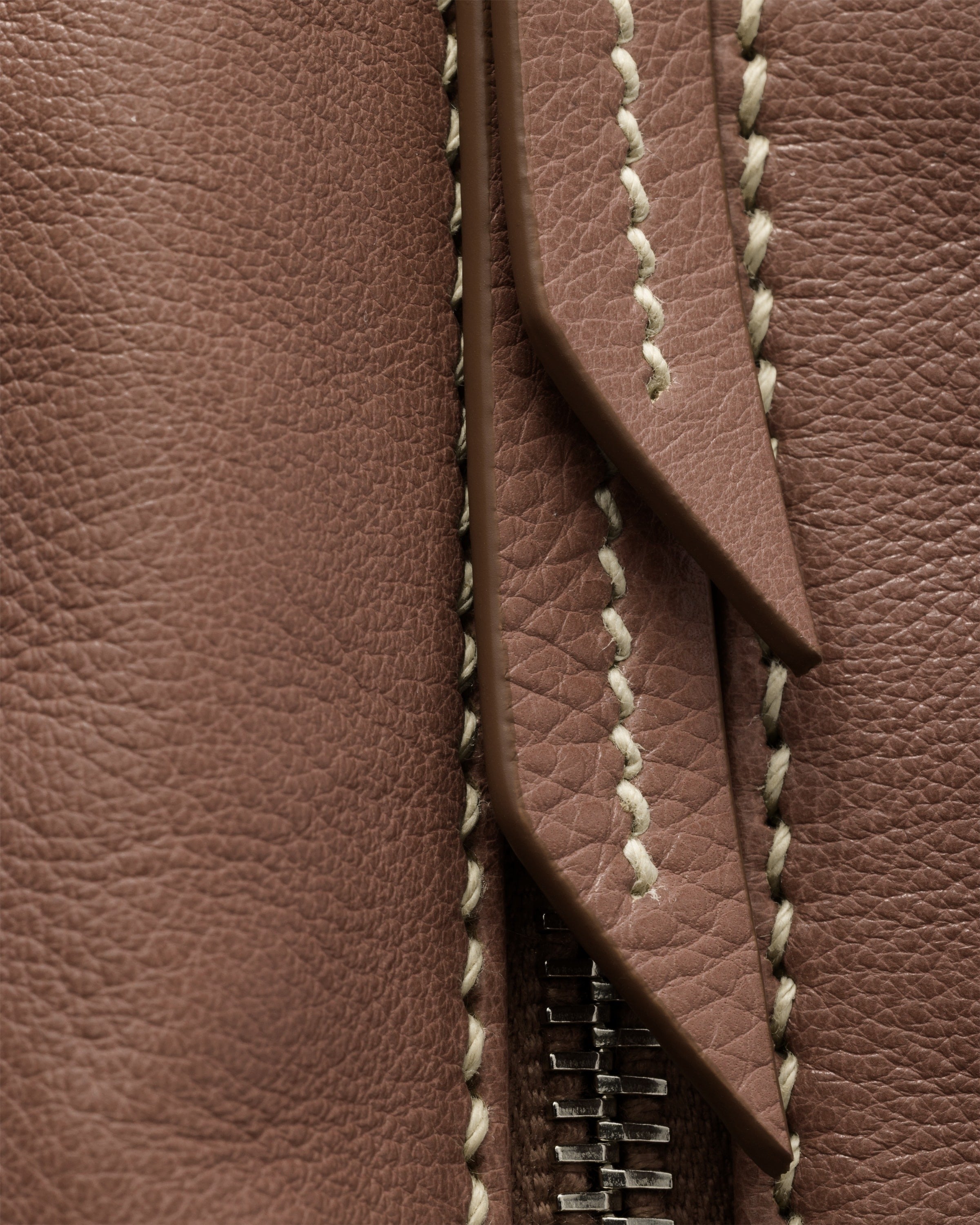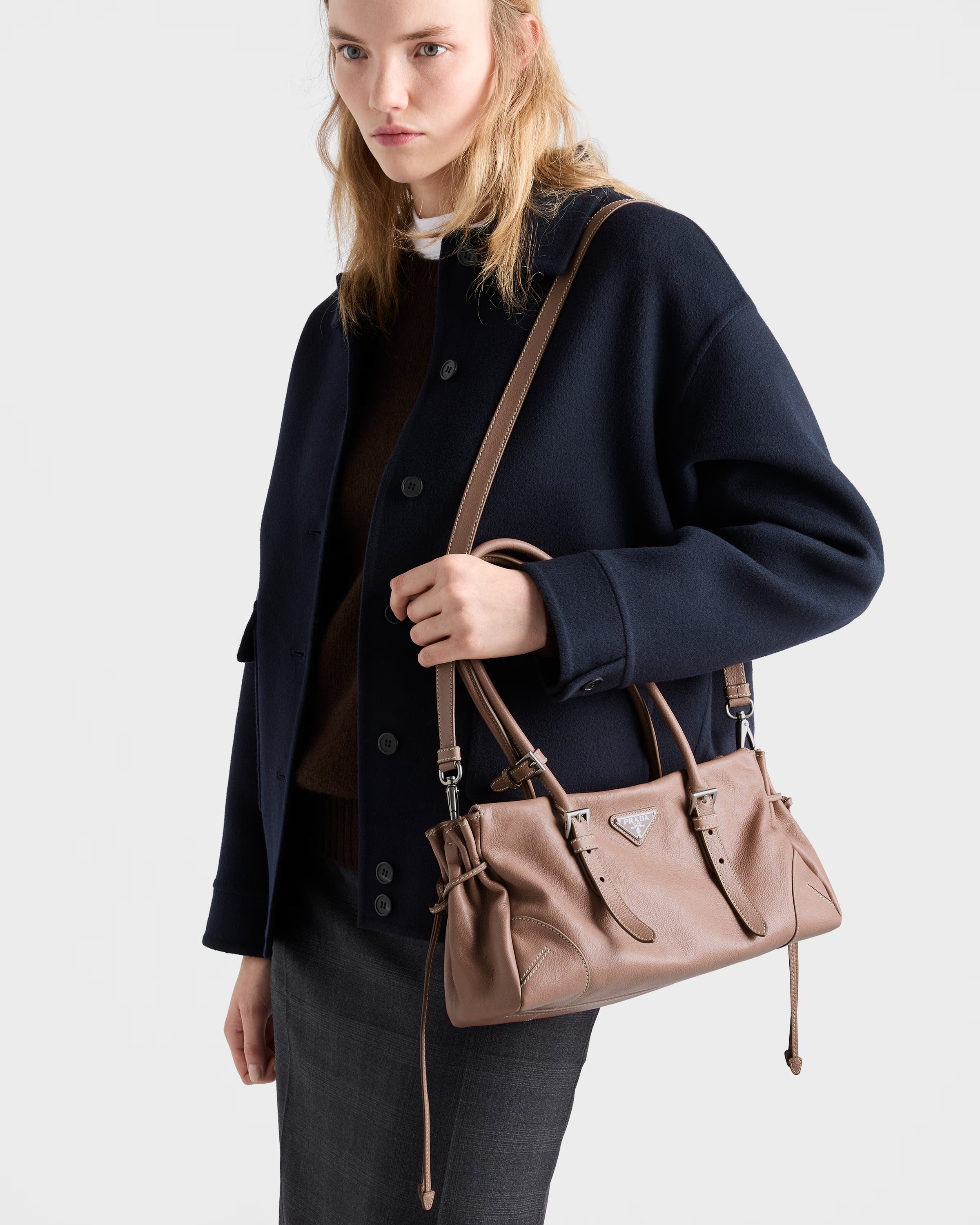 This leather bag with an antiqued finish embodies a sophisticated and contemporary personality. The geometric silhouette combines modernity and elegance with archive details., an expression of the constant dialogue between tradition and innovation. The metal buckles and side laces recall iconic styles of past Prada collections, while the long handles suggest a pragmatic and casual attitude.