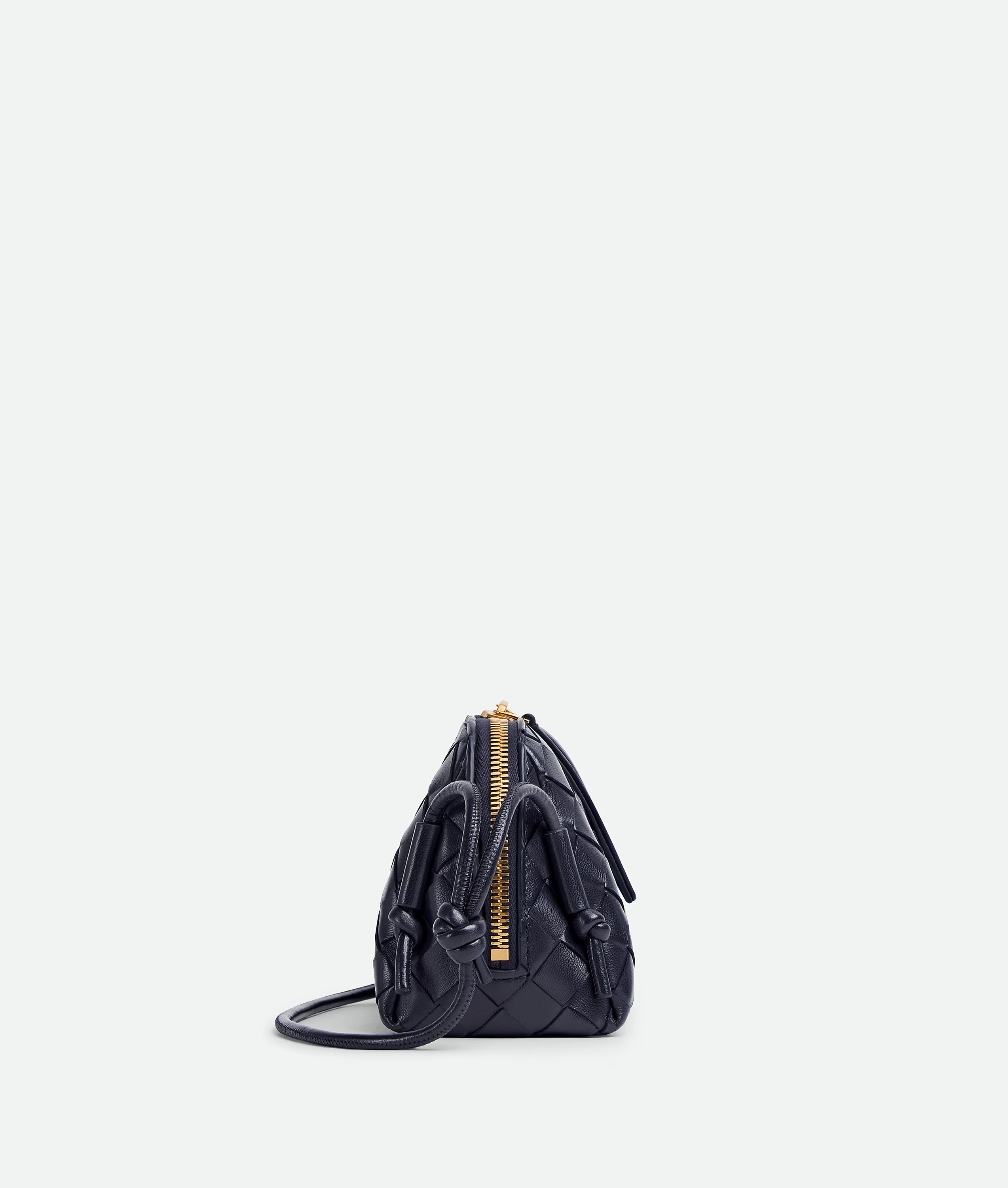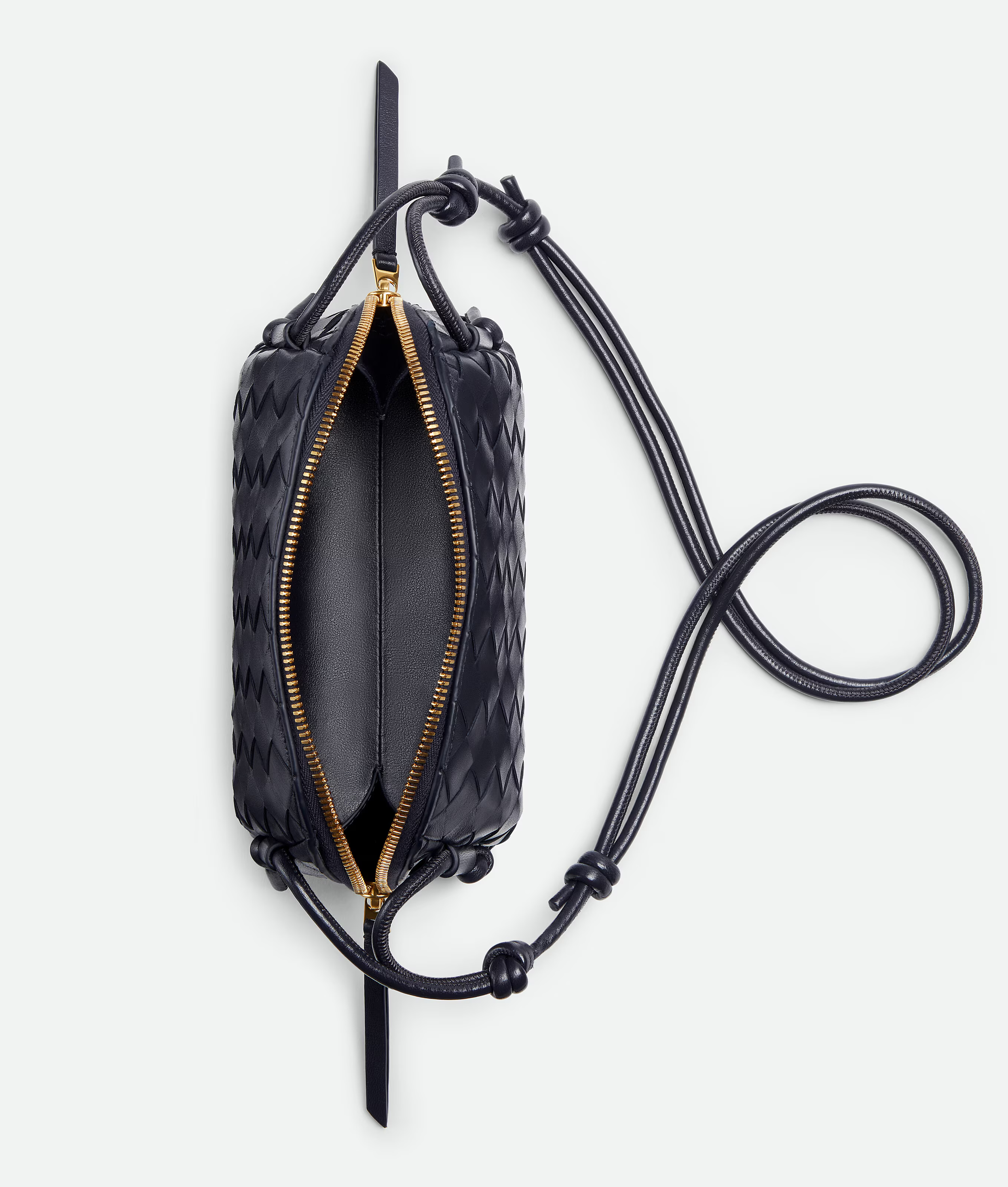 Pouch in Intrecciato nappa leather with adjustable tubular strap featuring sliding knot details.