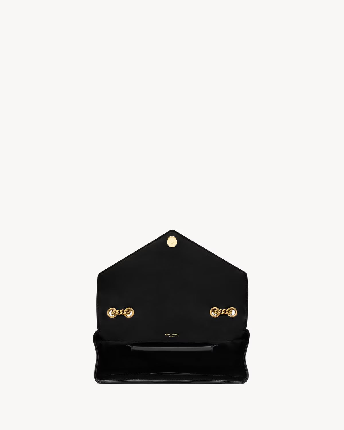 Finished with a sliding chain strap, the bag may be worn on the shoulder or crossbody.