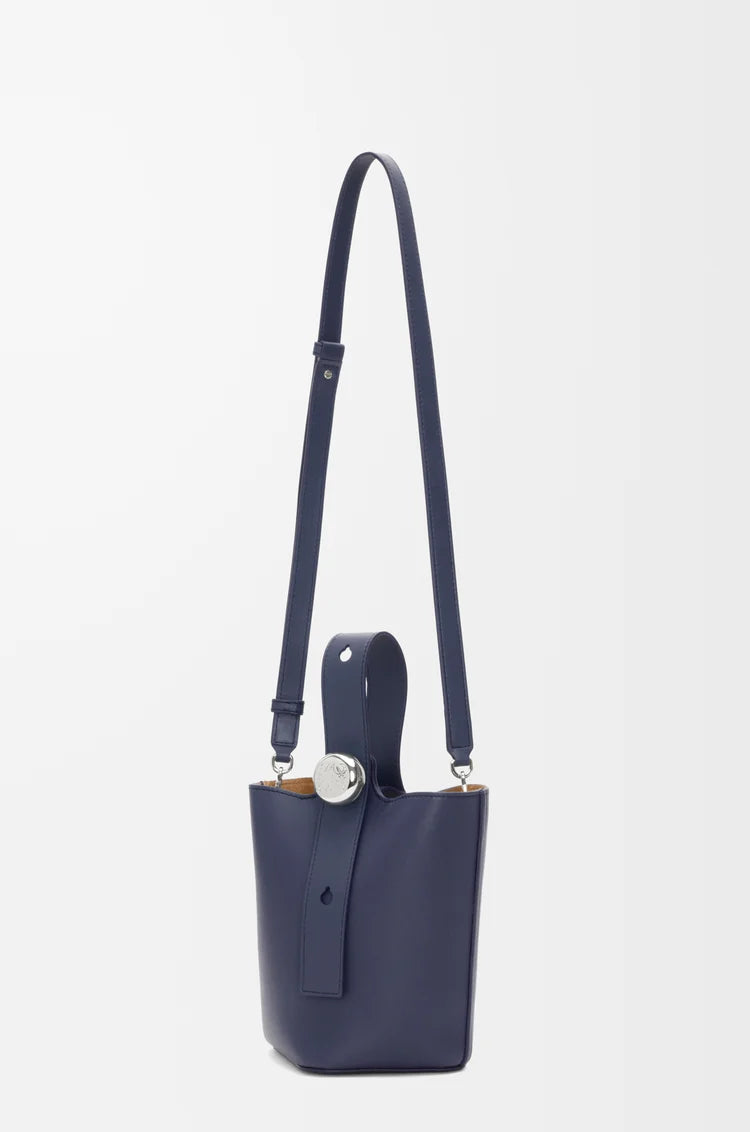 The Pebble is a minimalistic bucket bag with a wide strap adjustable through an oversized Pebble closure. This mini version is crafted in smooth calfskin.